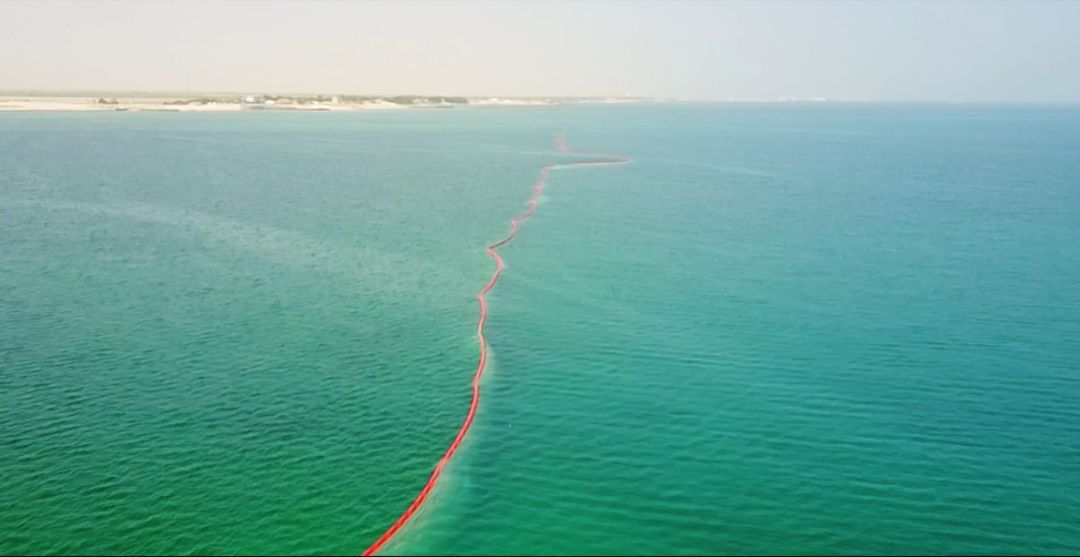 在水工結(jié)構(gòu)開工之前圍設(shè)防淤簾,其主要作用是形成一道防污屏障,用來阻隔和限制施工區(qū)域內(nèi)攪動(dòng)的泥沙及產(chǎn)生的污染物向施工區(qū)域以外擴(kuò)散,從而確保施工區(qū)域周圍的水體不受污染;同時(shí),防御簾還起到了阻攔海龜、海豚等海洋動(dòng)物誤入施工區(qū)域的作用。從環(huán)保的角度來講,這些伸展在海面上醒目的橙紅色“防污染警戒線”,傳達(dá)了中國企業(yè)綠色環(huán)保理念的生態(tài)保護(hù)線。
