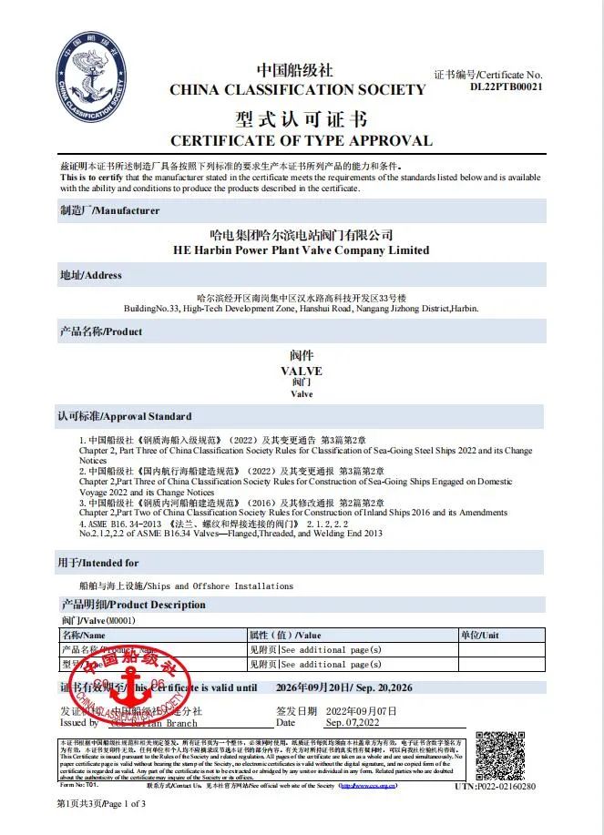 哈電集團(tuán)閥門公司中國船級社認(rèn)可證書換證成功