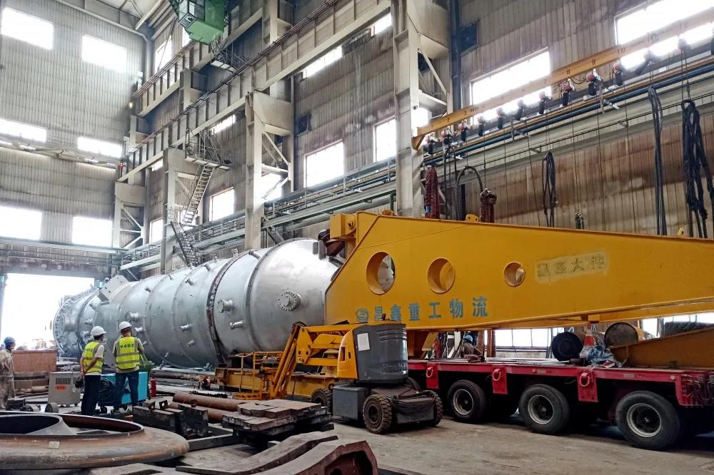 該設(shè)備總長(zhǎng)37米,凈重約505噸,在結(jié)構(gòu)上由氣化段和廢鍋段組成,兩段通過(guò)法蘭連接。由于設(shè)備整體重量、尺寸超過(guò)運(yùn)輸限制,氣化段和廢鍋段在哈電鍋爐產(chǎn)成后,分段運(yùn)往項(xiàng)目現(xiàn)場(chǎng)進(jìn)行組裝。由于疫情原因,哈電鍋爐工程設(shè)計(jì)中心、工藝部等部門相關(guān)技術(shù)人員無(wú)法赴現(xiàn)場(chǎng)提供安裝技術(shù)指導(dǎo)。在現(xiàn)場(chǎng)安裝的關(guān)鍵階段,哈電鍋爐技術(shù)人員放棄國(guó)慶假期休息時(shí)間,主動(dòng)加班,以視頻會(huì)議方式多次連線用戶方及項(xiàng)目現(xiàn)場(chǎng),研究解決現(xiàn)場(chǎng)組裝的難點(diǎn)問(wèn)題,確?,F(xiàn)場(chǎng)安裝順利進(jìn)行。同時(shí),技術(shù)人員保持手機(jī)24小時(shí)暢通,以便及時(shí)響應(yīng)用戶關(guān)切。最終,氣化段和廢鍋段于10月10日順利完成組裝。