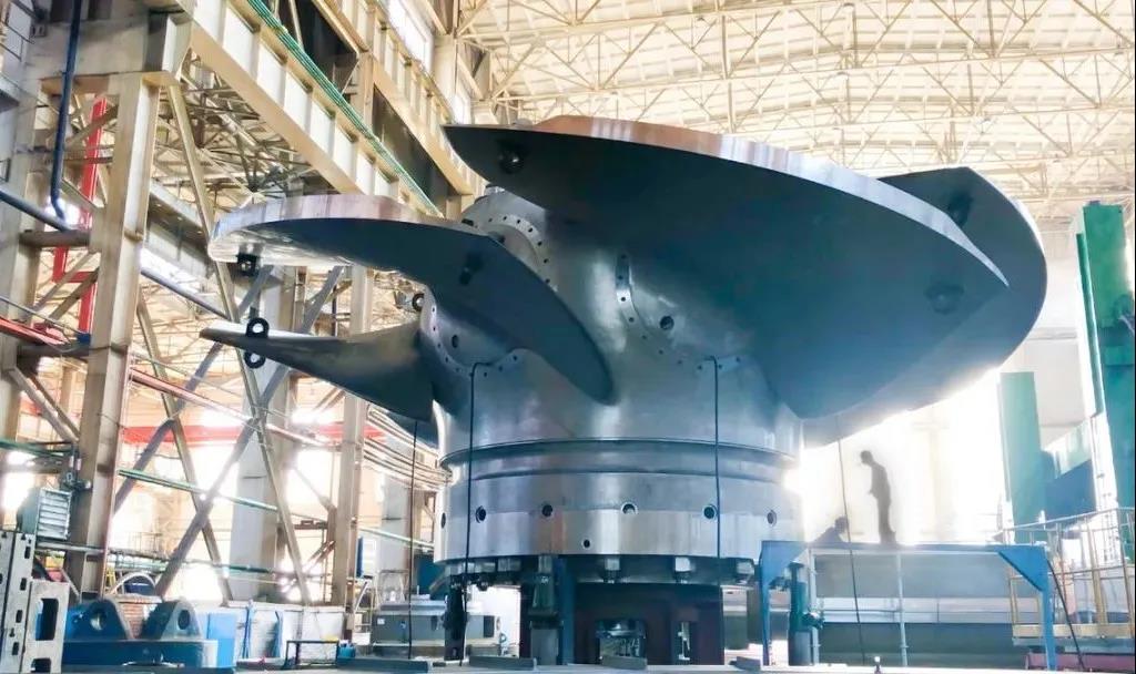 水口電站是華東地區(qū)最大的水電站,被譽(yù)為“五朵金花”之首。水口轉(zhuǎn)輪單機(jī)額定出力235兆瓦,總重超290噸,總高約6.4米,最大外圓直徑8米。轉(zhuǎn)輪裝配采用接力器缸傳動(dòng)形式,整體結(jié)構(gòu)復(fù)雜、裝配難度極大,需要雙吊車同步吊運(yùn)完成總裝任務(wù)。