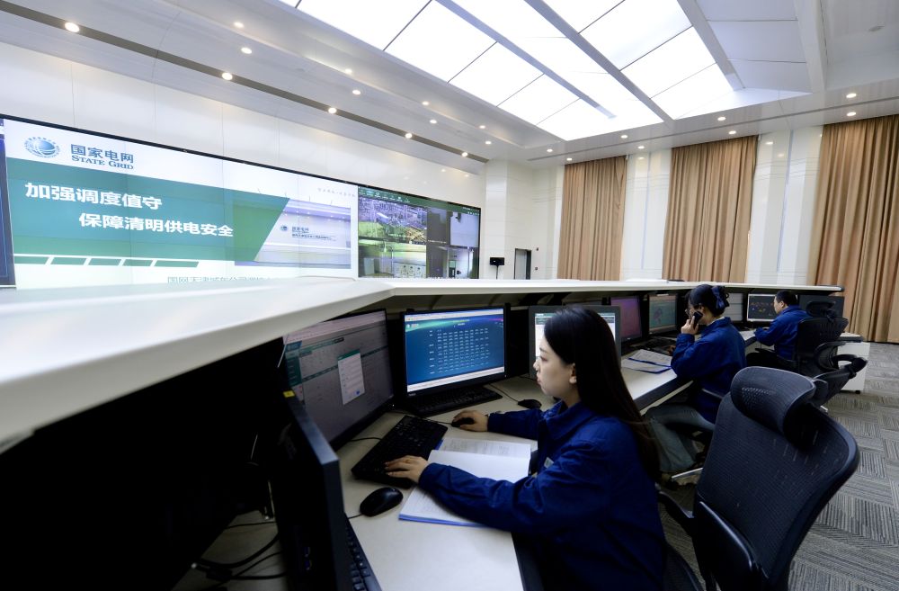 天津城東公司調(diào)度值班人員在監(jiān)測(cè)區(qū)域電網(wǎng)運(yùn)行狀態(tài)。新華社發(fā)