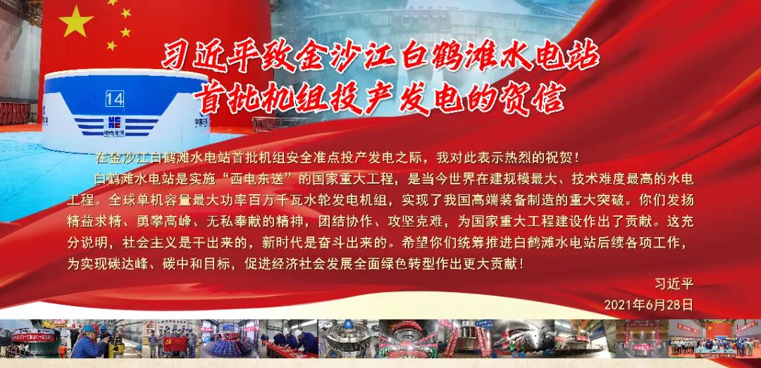 2021年6月28日,金沙江白鶴灘水電站首批機組投產(chǎn)發(fā)電,中共中央總書記、國家主席、中央軍委主席習(xí)近平致信祝賀,寄語廣大項目建設(shè)者——統(tǒng)籌推進白鶴灘水電站后續(xù)各項工作,為實現(xiàn)碳達(dá)峰、碳中和目標(biāo),促進經(jīng)濟社會發(fā)展全面綠色轉(zhuǎn)型作出更大貢獻(xiàn)!