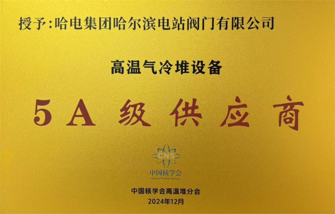 近日,哈電閥門喜獲中國核學會高溫堆分會頒發(fā)的“高溫氣冷堆設備5A級供應商供”榮譽稱號,標志著客戶對哈電閥門的高度認可,也標志哈電閥門在該領域取得了跨越式成績。