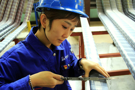 在電機(jī)公司線圈分廠有這樣一位人人稱頌的貼心好班長(zhǎng),她就是哈爾濱市五一巾幗標(biāo)兵、哈電集團(tuán)優(yōu)秀共產(chǎn)黨員、電機(jī)公司巾幗十佳標(biāo)兵,水電定子絕緣班班長(zhǎng)徐鑫。身材單薄瘦弱的她,在工作中,卻總是不甘示弱,對(duì)待每一項(xiàng)工作都精益求精,掌握一手精湛的操作技能。在白鶴灘定子線棒生產(chǎn)技術(shù)準(zhǔn)備過程中,她積極踐行集團(tuán)公司“提質(zhì)增效黨員先行”黨建載體工程要求,以公司黨內(nèi)主題實(shí)踐活動(dòng)為載體,帶領(lǐng)班組黨員刻苦鉆研創(chuàng)新,設(shè)計(jì)制作了專用裝置,并在真機(jī)試驗(yàn)線棒生產(chǎn)中應(yīng)用,為白鶴灘定子線棒質(zhì)量提升,打造精品工程奠定了堅(jiān)實(shí)的基礎(chǔ)。對(duì)待班組同事,她更是賦予了超強(qiáng)的耐心,這也使得同事們之間關(guān)系和諧融洽,形成了“快樂工作、快樂生活”的良好工作氛圍。