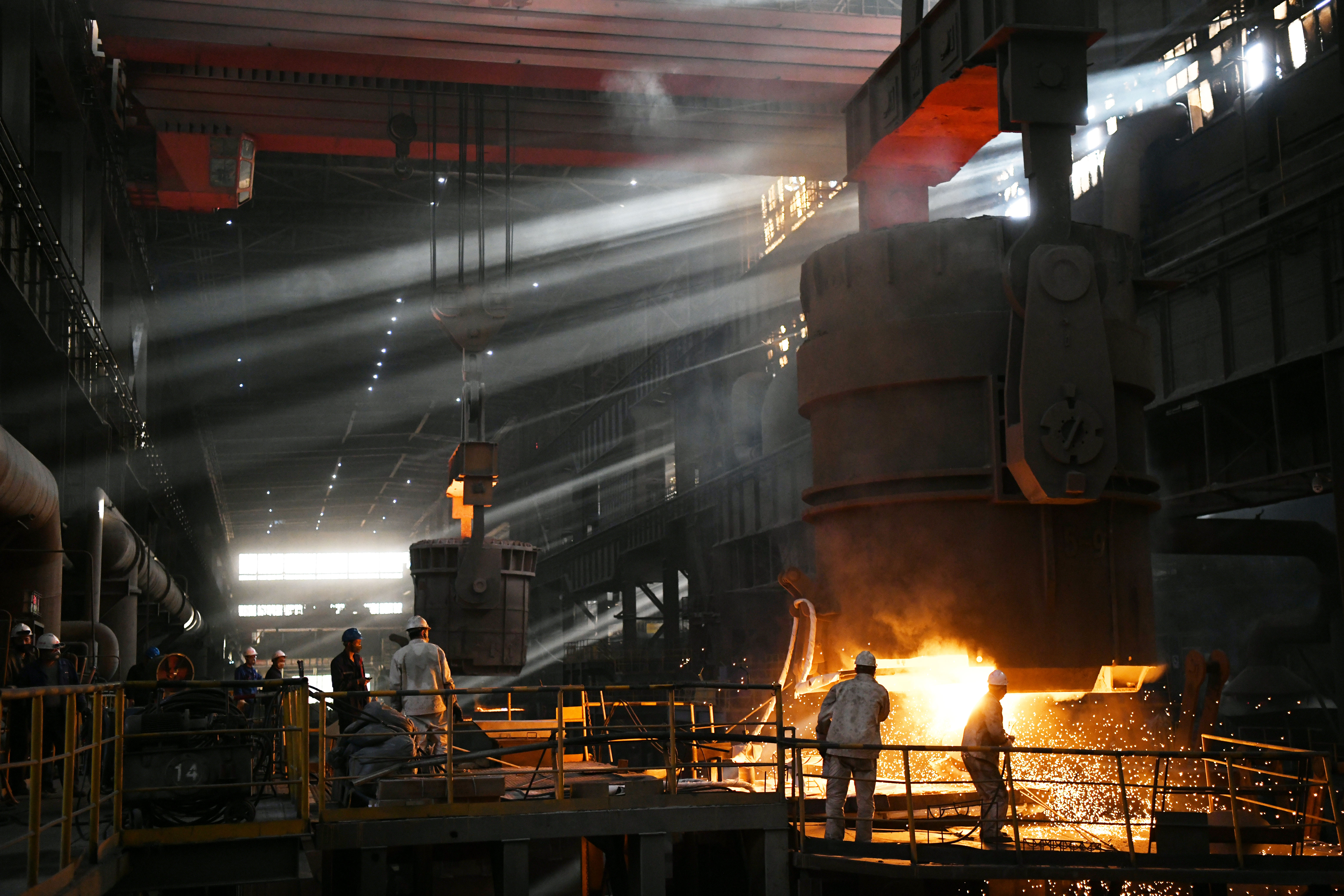 ↑在中國一重集團有限公司的廠房內,工人在進行生產作業(yè)(8月29日攝)。