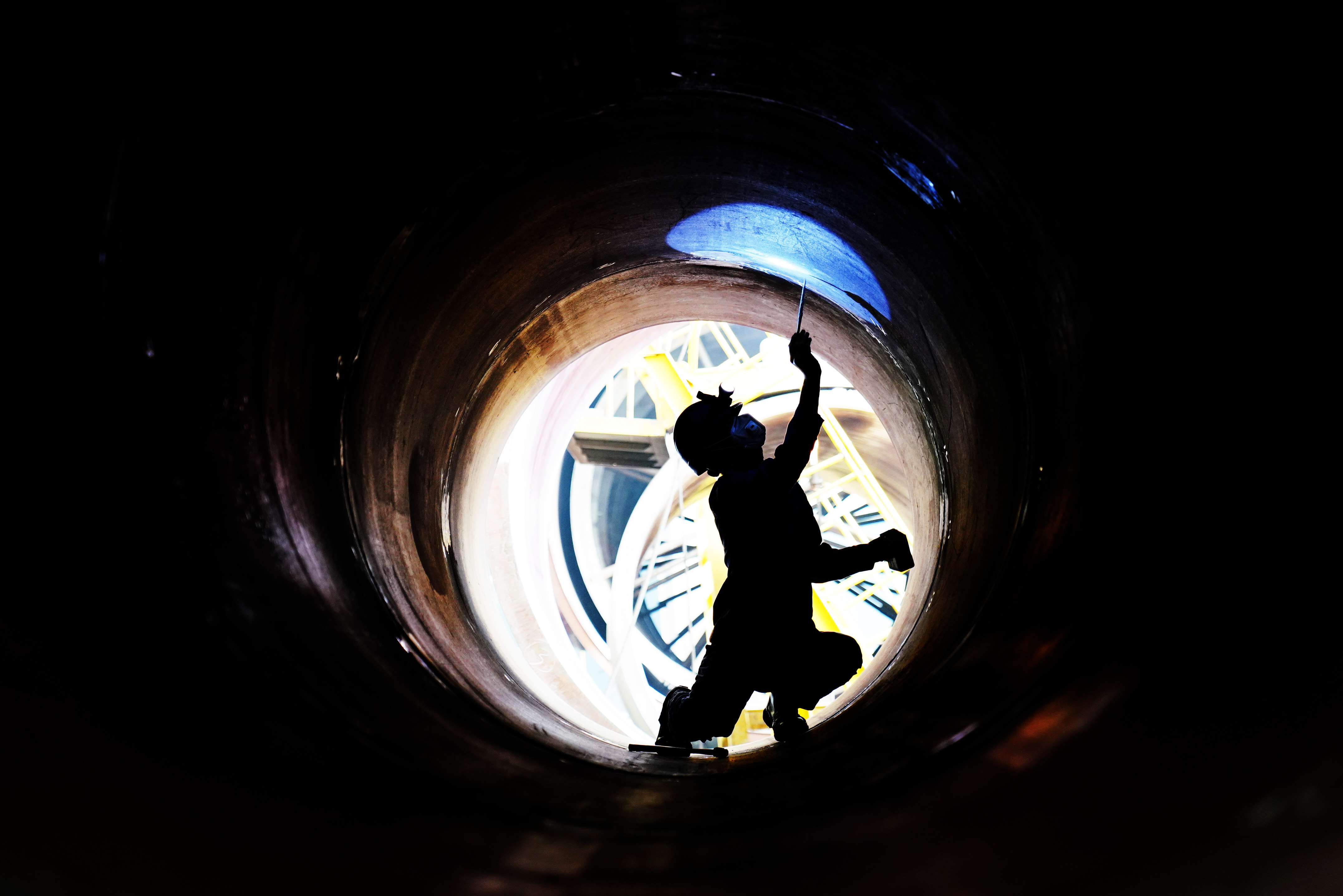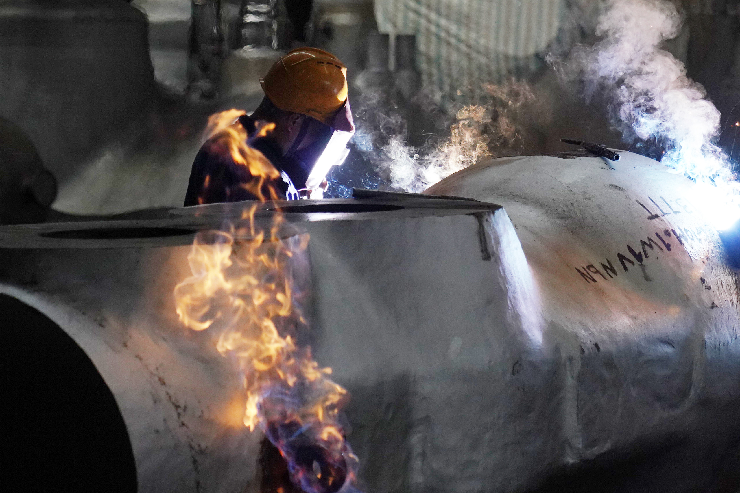 ↑在哈電集團哈爾濱鍋爐廠有限責任公司廠房內,工人在進行生產作業(yè)(9月4日攝)。
