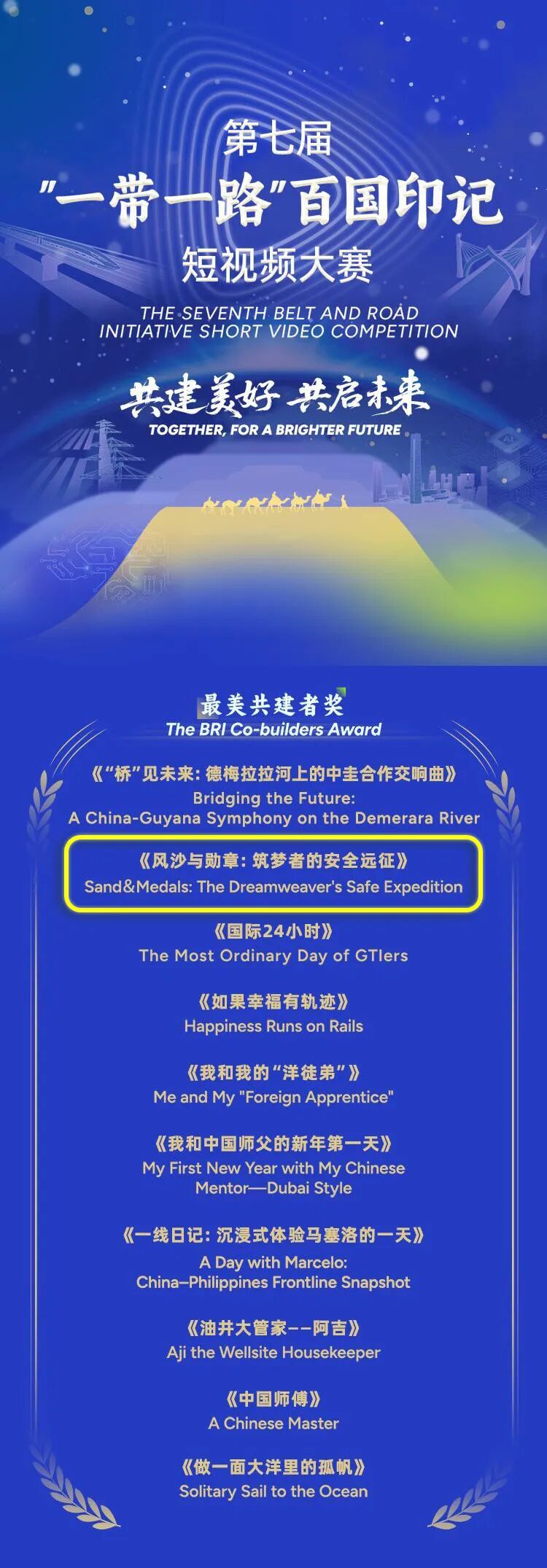 日前,由中國(guó)公共外交協(xié)會(huì)、環(huán)球網(wǎng)聯(lián)合主辦,國(guó)務(wù)院國(guó)資委新聞中心、中國(guó)駐柬埔寨王國(guó)大使館、柬埔寨王國(guó)駐華大使館、中國(guó)駐南非共和國(guó)大使館、中國(guó)駐保加利亞共和國(guó)大使館、中國(guó)駐塞爾維亞共和國(guó)大使館支持的第七屆“一帶一路”百國(guó)印記短視頻大賽落下帷幕,大賽以“共建美好,共啟未來”為主題,吸引了來自全球130余個(gè)國(guó)家和地區(qū)的近2000部作品參賽。經(jīng)過激烈角逐,共有161部作品脫穎而出,哈電集團(tuán)短視頻作品《風(fēng)沙與勛章:筑夢(mèng)者的安全遠(yuǎn)征》榮獲“最美共建者”獎(jiǎng)。