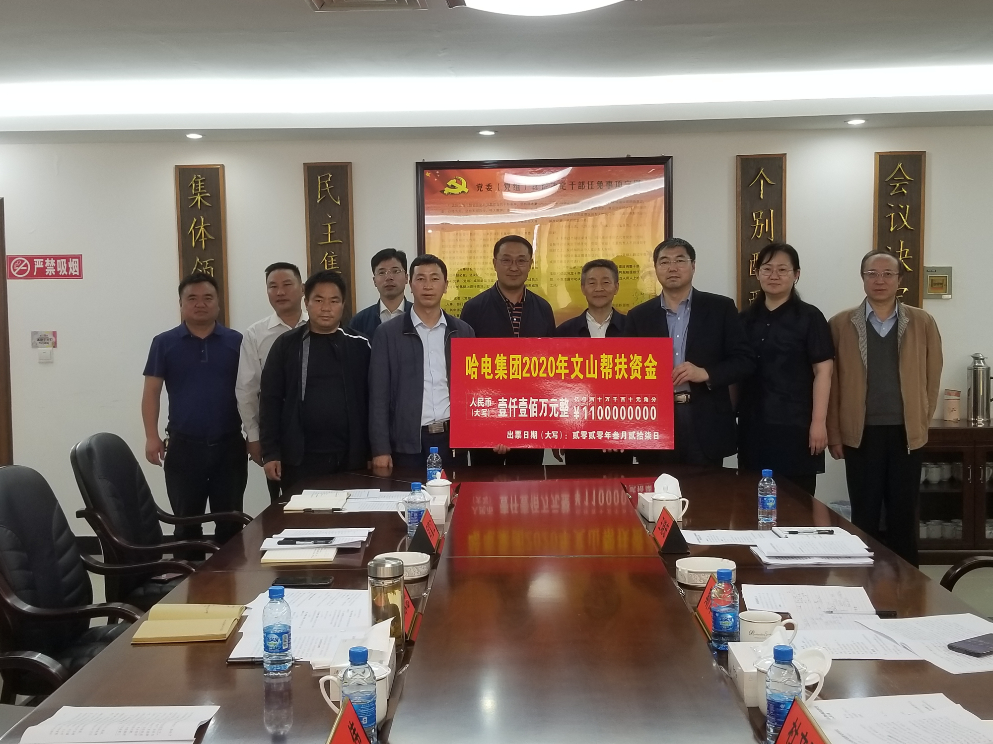 2020年3月,哈電集團(tuán)黨委書(shū)記、董事長(zhǎng)斯?jié)煞蛞恍芯团朔咔橛绊?、決戰(zhàn)決勝脫貧攻堅(jiān)進(jìn)行了深入交流,并舉行了哈電集團(tuán)2020年文山資金捐贈(zèng)儀式。