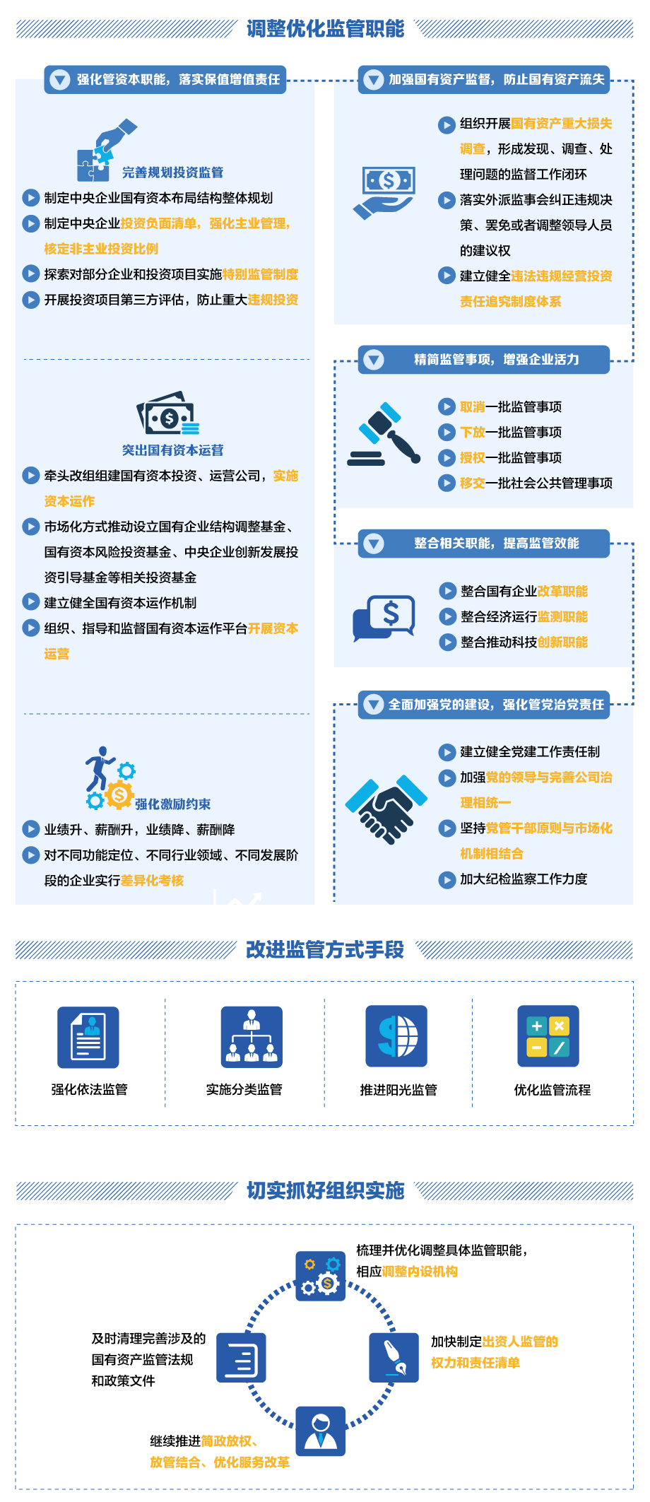 | 黨的十八大以來,國務(wù)院國資委認(rèn)真貫徹落實黨中央、國務(wù)院關(guān)于深化國有企業(yè)改革的決策部署,準(zhǔn)確把握國有資產(chǎn)監(jiān)管機(jī)構(gòu)的出資人代表職責(zé)定位,堅定不移深化國有企業(yè)改革,探索完善國有資產(chǎn)監(jiān)管體制機(jī)制,積極推進(jìn)國有企業(yè)結(jié)構(gòu)調(diào)整、創(chuàng)新發(fā)展,為實現(xiàn)國有資產(chǎn)保值增值、防止國有資產(chǎn)流失、發(fā)展壯大國有經(jīng)濟(jì)作出了積極貢獻(xiàn)。但與此同時,國有資產(chǎn)監(jiān)督機(jī)制尚不健全,國有資產(chǎn)監(jiān)管中越位、缺位、錯位問題依然存在,亟需加快調(diào)整優(yōu)化監(jiān)管職能和方式,推進(jìn)國有資產(chǎn)監(jiān)管機(jī)構(gòu)職能轉(zhuǎn)變,進(jìn)一步提高國有資本運(yùn)營和配置效率。4月27日,國務(wù)院辦公廳轉(zhuǎn)發(fā)《國務(wù)院國資委以管資本為主推進(jìn)職能轉(zhuǎn)變方案》,明確提出調(diào)整優(yōu)化國資監(jiān)管職能,改進(jìn)監(jiān)管方式手段,著力提高國有資本效率,增強(qiáng)國有企業(yè)活力。文件還明確了精簡的國資監(jiān)管事項共43項。 |
