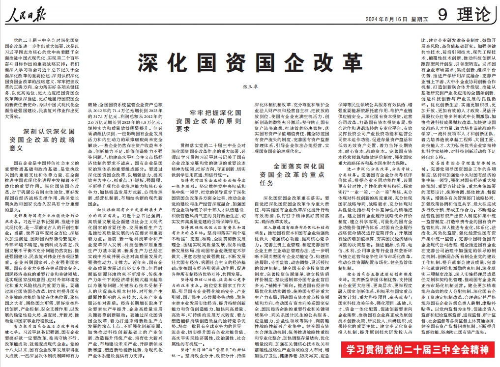 黨的二十屆三中全會(huì)對(duì)深化國(guó)資國(guó)企改革進(jìn)一步作出重大部署,這是以習(xí)近平同志為核心的黨中央著眼于全面推進(jìn)中國(guó)式現(xiàn)代化、實(shí)現(xiàn)第二個(gè)百年奮斗目標(biāo)作出的重要戰(zhàn)略安排。我們要深入學(xué)習(xí)領(lǐng)會(huì)習(xí)近平總書(shū)記關(guān)于全面深化改革的重要論述,深刻認(rèn)識(shí)深化國(guó)資國(guó)企改革的戰(zhàn)略意義,牢牢把握改革的正確方向,全力落實(shí)好各項(xiàng)關(guān)鍵任務(wù),以更高站位、更大力度把國(guó)資國(guó)企改革向縱深推進(jìn),更好地履行國(guó)資國(guó)企的新責(zé)任新使命,為以中國(guó)式現(xiàn)代化全面推進(jìn)強(qiáng)國(guó)建設(shè)、民族復(fù)興偉業(yè)作出更大貢獻(xiàn)。
