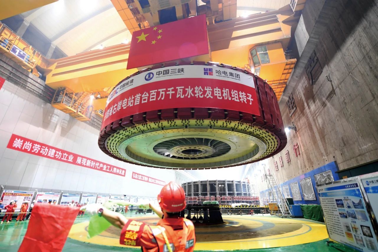 2020年9月9日,電機(jī)公司研制的白鶴灘右岸電站首臺全球單機(jī)容量最大功率百萬千瓦水輪發(fā)電機(jī)組轉(zhuǎn)子吊裝成功。